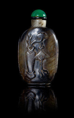 of flattened oval form, both sides carved in relief depicting archaistic vessels carrying precious objects, raised on a short oval foot, having a green jadeite stopper.