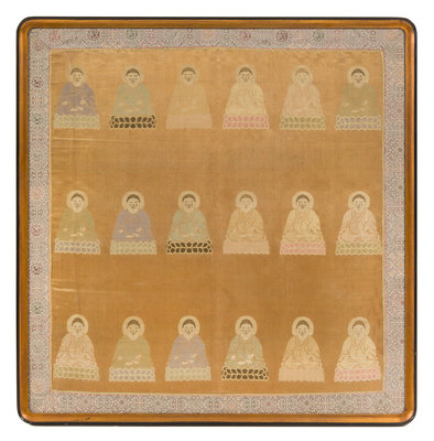 the square panel worked in multi-colored threads showing three rows of seated Buddha figures against a gilt ground, framed.