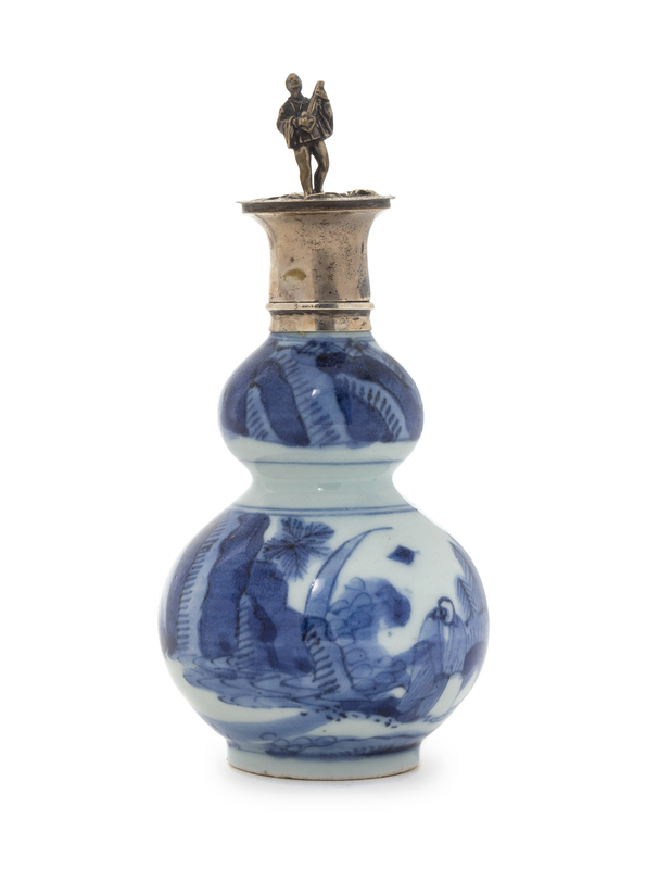 depicting a mountainous scene, the neck and the mouth with silver mounting and surmounted by a finial in the form of a male musician.