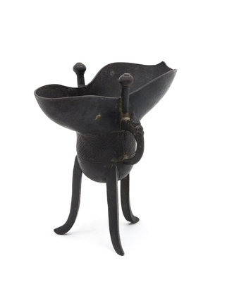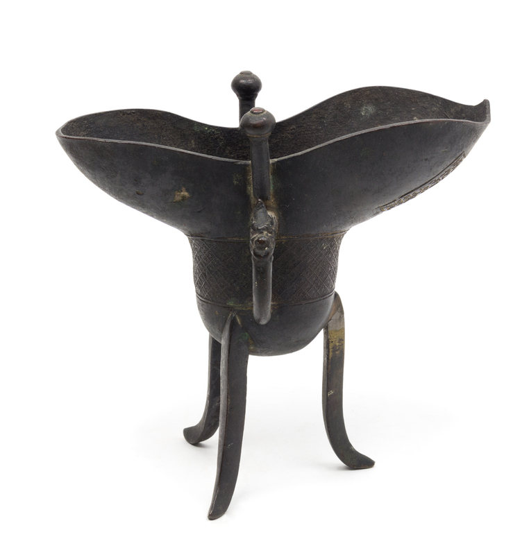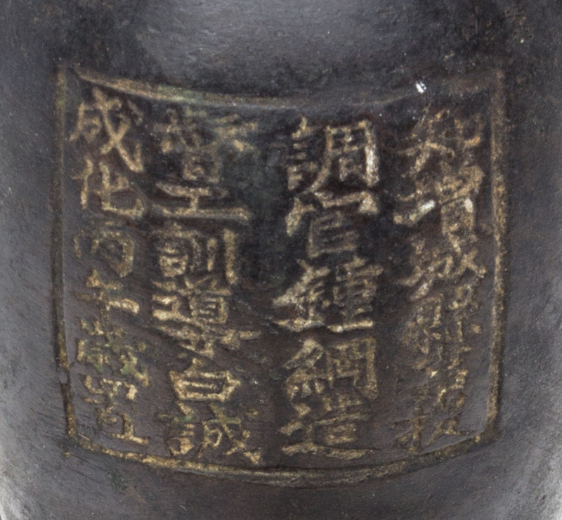 the deep body raised on three splayed legs, the sides cast with a wide band of geometric designs, having a C-scroll handle issuing from a dragon head, the spout carved with a date Chenghua Bingwu nian (corresponding to year 1486) within a square panel, the mouth rim surmounted by a pair of capped posts.