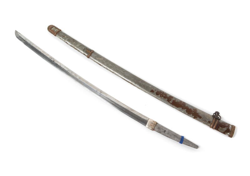 with the metal saya painted brown, a scored habaki, an obitori decorated with a chrysanthemum overlaid with a cherry blossom, a double-banded ashi, a semegane with a slightly foliate form, a cherry blossom decorated koiguchi and an ishizuke decorated with cherry blossom motifs and an hourglass shaped opening on either side, the ishizuke bearing a six-character makers mark on one side, the other side a manufacturing number reading 213917 ban, the nakago bearing a mekugi-ana and inscribed with a nine-character makers mark, the mune of ihori form and the boshi of yakizume shape, the hamon forged in the suguha fashion with an exceedingly straight form to it.