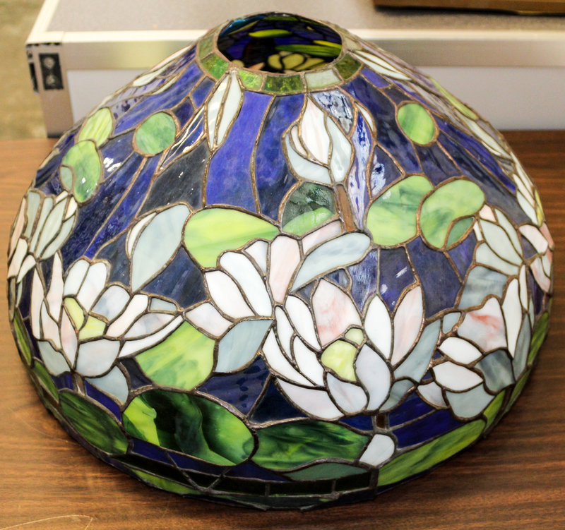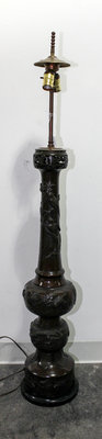 A Japanese Bronze Lamp with an Associated American Leaded Glass Shade