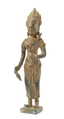 the deity cast standing on a square base with both hands bearing floral stems, wearing a loose dhoti and elaborate jewelry, the face having a subtle smile surmounted by a peaked crown.