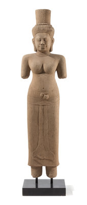 the figure depicted standing in samabangha, wearing a long sampot secured at the hips by a wide belt, the serene face with almond shaped eyes, flanked by elongated earlobes, the hair pulled into an elaborate chignon, raised on a later black stand.