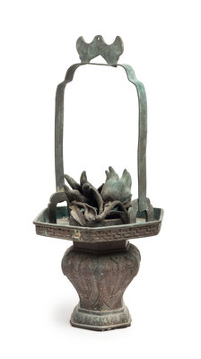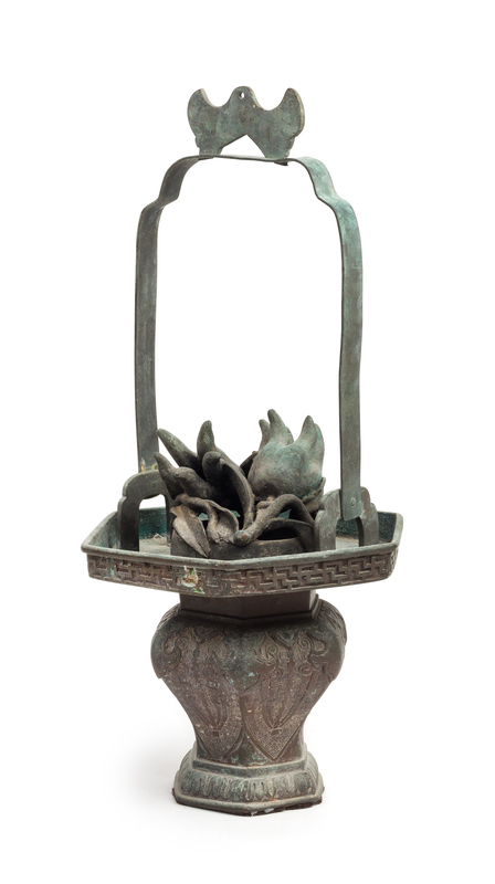 cast in the form of a basket, surmounted by a group of Buddhist hand cirtron forming the cover, having an overhanging handle.