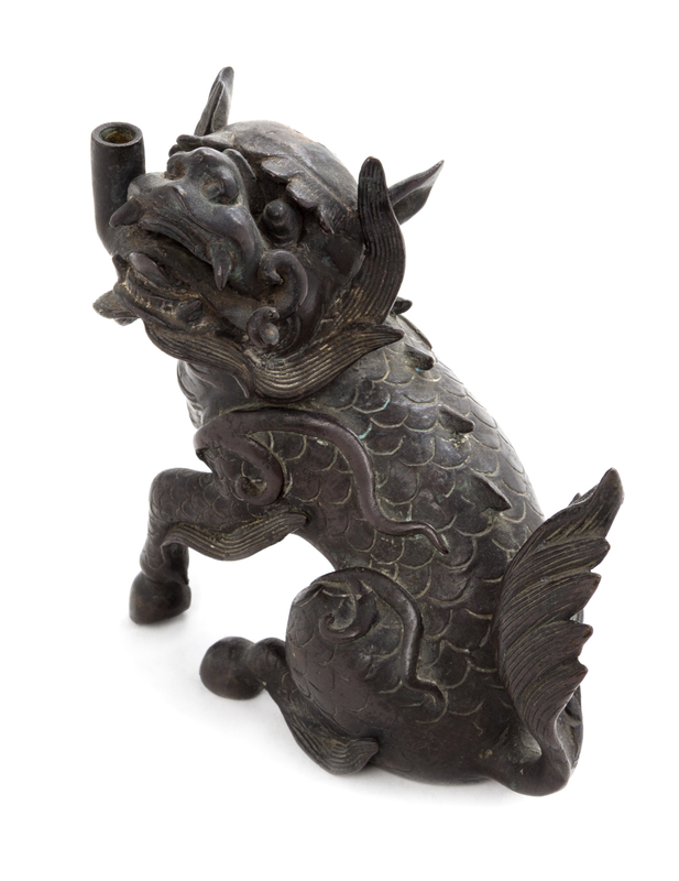 the animal figure depicted seated with its head turned to its left, the body incised with detailed scales and the bushy tail flicked upward, the face cast with bulgy eyes, large nostrils and wide open mouth bearing a sprig forming the candle holder.