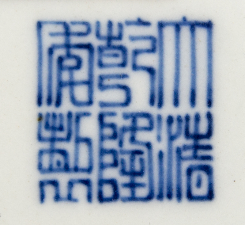 the compressed globular body resting on a short straight foot rising to a tall cylindrical neck and a slightly flared mouth, the underside bearing a Qianlong six-character mark in underglaze blue.
