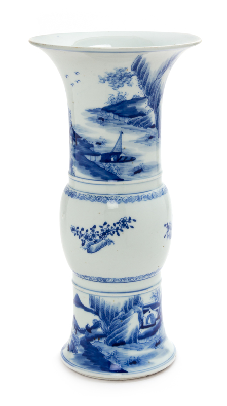 having a central globular section raised on a tall spreading foot, surmounted by an everted mouth, the upper and lower registers painted with mountainous landscape scenes, the middle section with floral sprays.