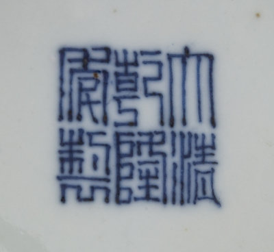 the faceted baluster body raised on a splayed foot, surmounted by a tall neck and a flared mouth, painted with floral sprays, pomegranate and peach branches, the underside bearing a Qianlong six-character underglaze blue mark.