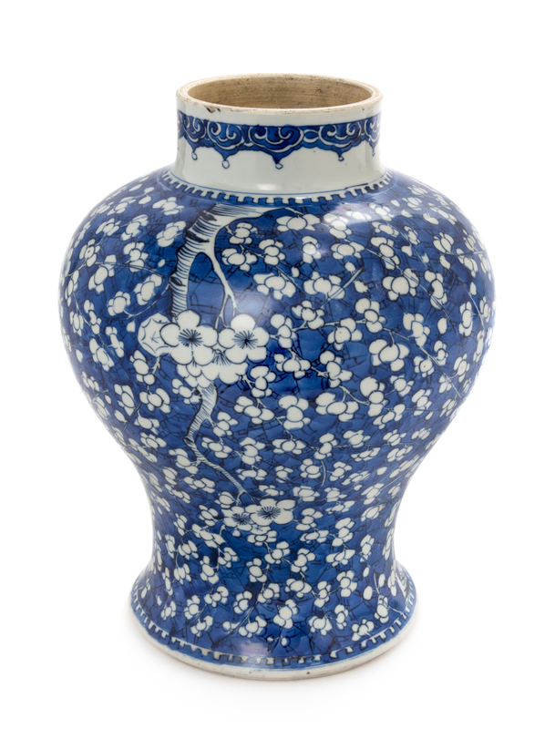 of baluster form with board shoulders, the main panel densely painted with flowering prunus branches against an ice crackled ground, the underside with a double ring.