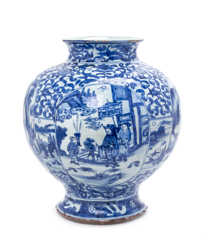 the globular body raised on a spreading foot and surmounted by a flared mouth, the main panel painted with four large roundels, two enclosing Chinese classic scenes Xizhi ai er (Xizhi loving geese) and xie qin fang you (visiting friends with a qin), the other two showing warriors and attendants, interspersed with landscape panels and foliate scrolls.