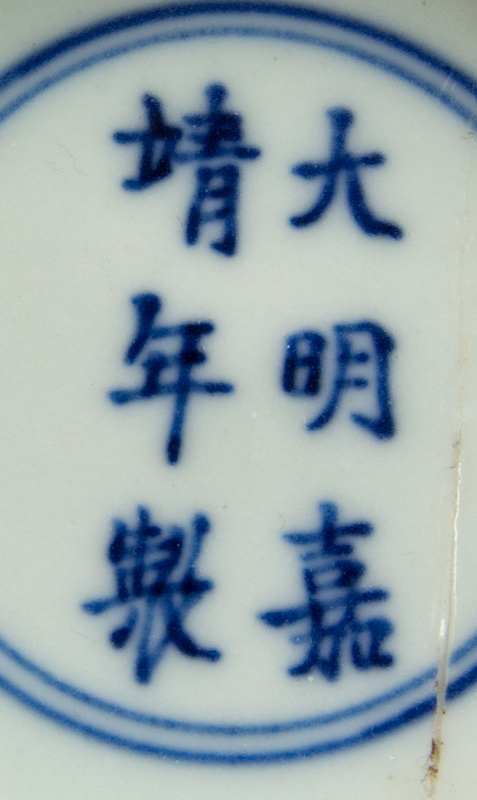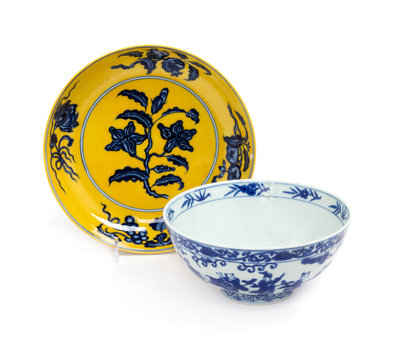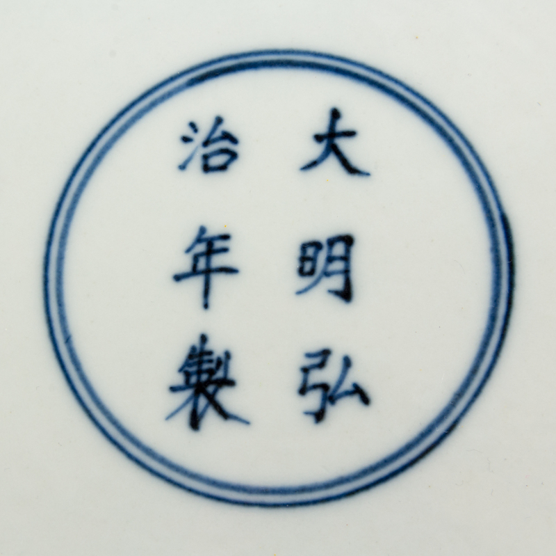 the first an underglaze blue decorated and yellow ground plate, painted with sanduo motif, the underside bearing an apocryphal Hongzhi six-character mark in underglaze blue within a double ring; the second a blue and white bowl painted with playful figures, the underside bearing a Jiajing six-character mark in underglaze blue.