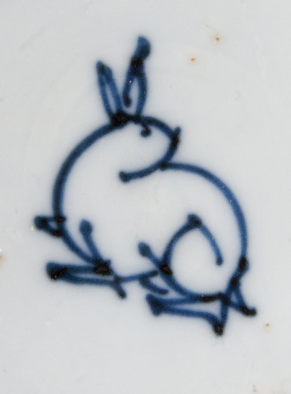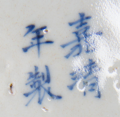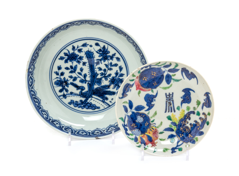 the larger example decorated with a bird underneath flowering branches, the underside bearing a rabbit-form mark; the smaller one having underglaze blue, famille rose and gilt decorated fruiting pomegranates and winged bats enclosing a central shou character, the underside bearing an apocryphal Jiajing four-character mark.