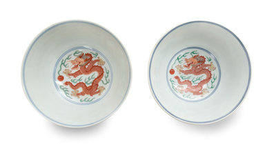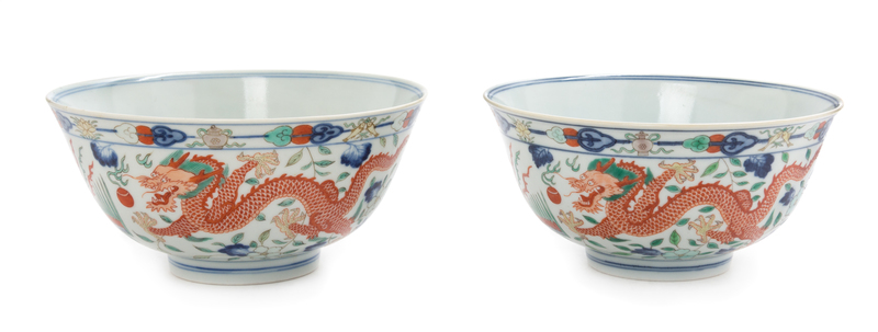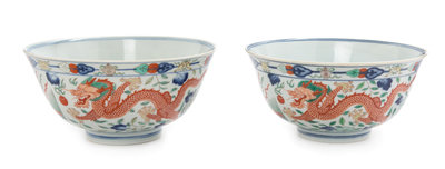 A Pair of Wucai Porcelain 'Dragon and Phoenix' Bowls