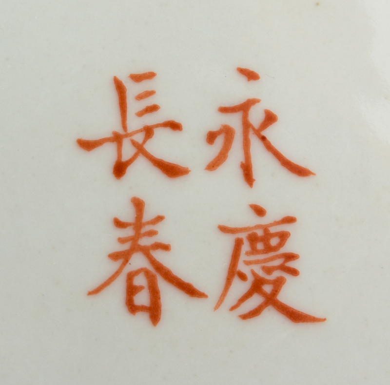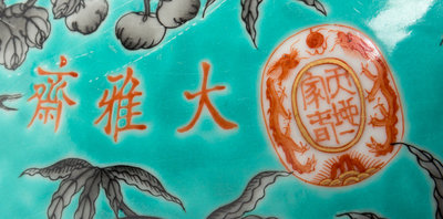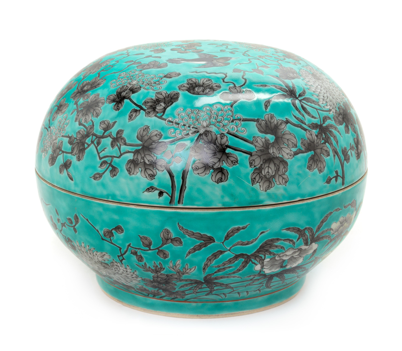 of circular form, painted to the exterior to show birds amidst meandering branches with flowering chrysanthemums and peonies, all reserved on a turquoise ground, the cover bearing three characters Da Ya Zhai and a seal tiandi yi jia chun, the underside bearing a yong qing chang chun four-character mark.