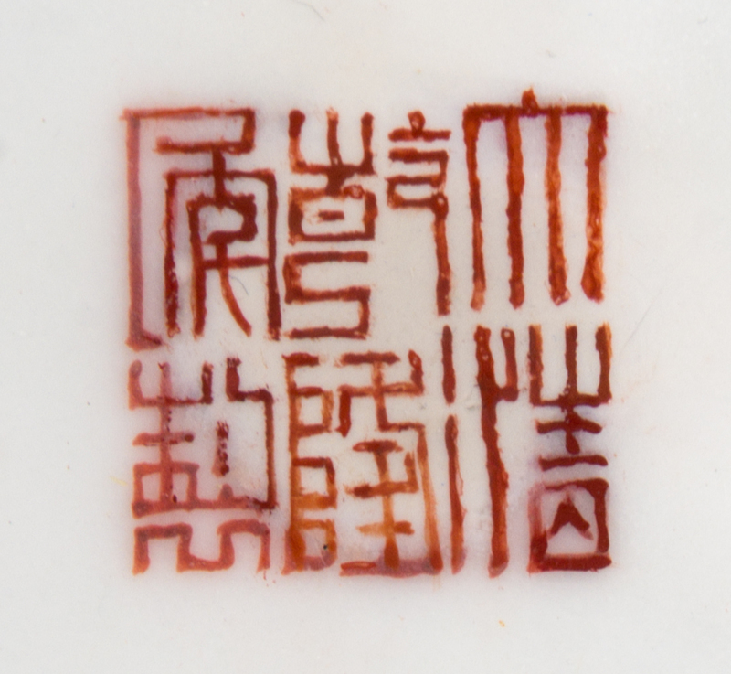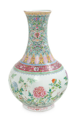 the globular body rising to a tall neck and a flared mouth, the main panel decorated with flowering peonies, underneath lotus scrolls against a ruby-red ground, a band of lappet leaves and further lotus scrolls reserved on a turquoise ground, the underside bearing a Qianlong six-character iron red mark.
