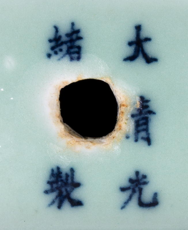 of archaic hu - form with a pair of lug handles, the front and back each with a raised peach-form panel, painted to the exterior with meandering branches of fruiting peaches, the underside bearing a Guangxu six-character mark in underglaze blue, the base drilled.