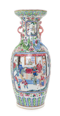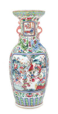 the baluster body rising to a tall neck, surmounted by a flared mouth, painted with rectangular panels showing scholars and officials in various settings, interspersed with floral scrolls, the shoulders and the neck applied with multiple sinuous chilongs.
