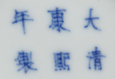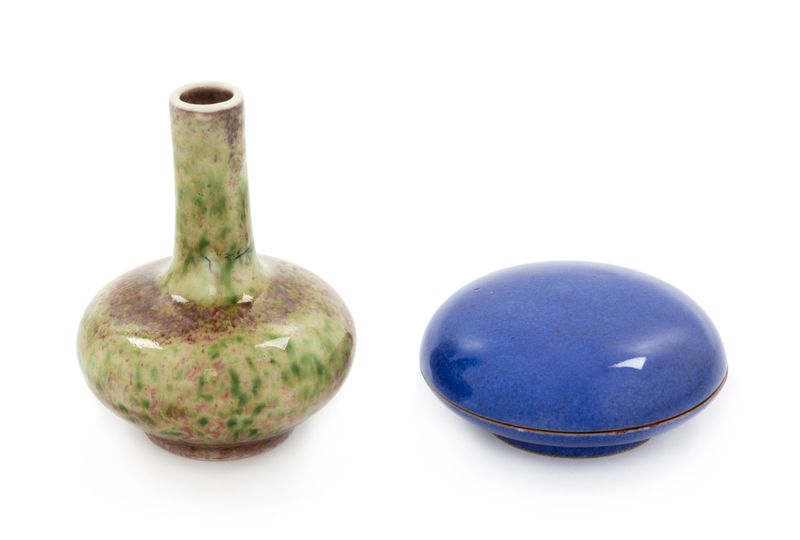 the first a peachbloom glazed bottle vase, the second a blue glazed circular coverd seal paste box, each bearing a Kangxi six-character mark in underglaze blue.