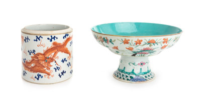 the first an iron red decorated underglaze blue jar, of cylindrical form and painted to show dragons amongst clouds, the second a famille rose offering dish with floral decoration.