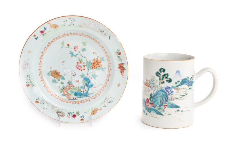 the first a circular plate, painted to the center with a crane standing besides flowering branches issuing from rockworks, enclosed by a border with birds alternating floral sprigs; the second a mug painted with a continuous landscape scene.