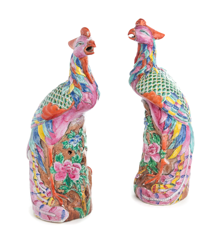A Pair of Chinese Export Famille Rose Porcelain Figures of Phoenix