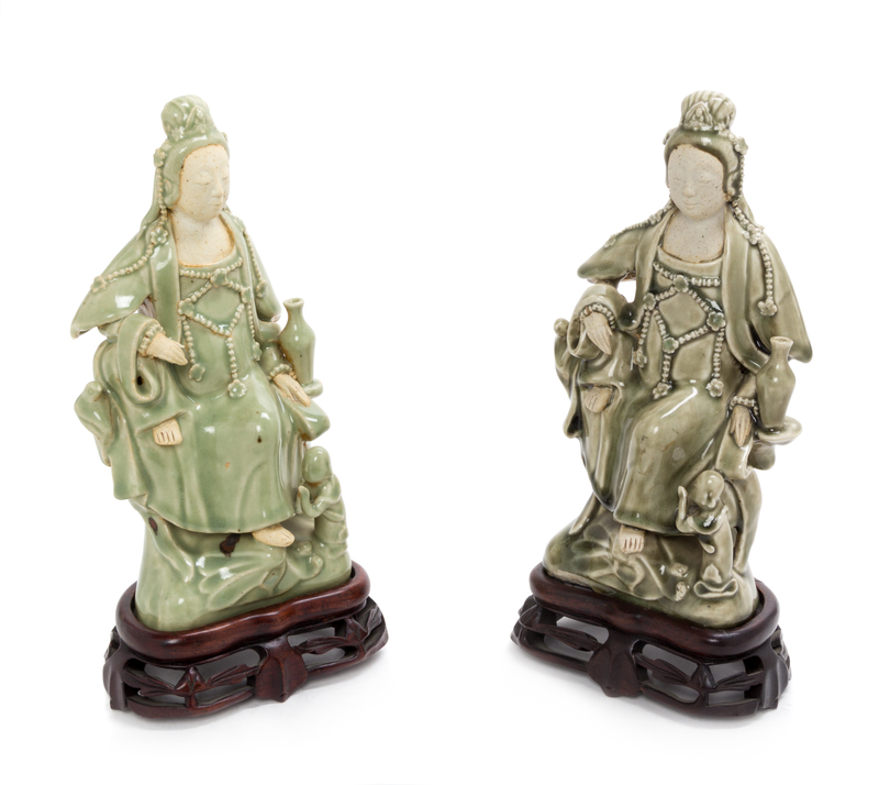 each figure depicted seated on rockery with the right leg raised and the right hand resting on the right knee, dressed in draped robes and beaded jewelry, all hair combed into a high chignon, further raised on a fitted hardwood stand.