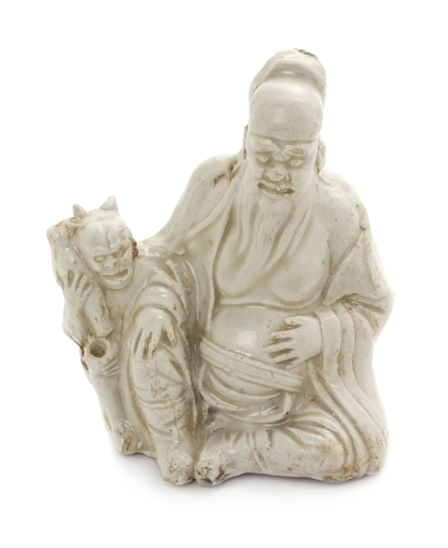 depicting the seated immortal Zhong Kui, wearing draped robes opening to the chest, a smaller ghost figure standing next to him bearing a vase in the right hand.