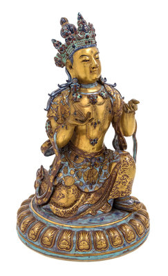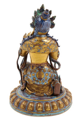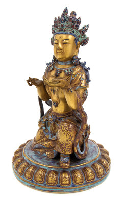 the deity depicted kneeling on a single lotus plinth with the left leg raised and both hands held in front of the chest, wearing a draped dhoti, a loose waist band and a shawl opening to the chest, the bare upper body adorned with elaborate beaded jewelry, the face having a benevolent expression, all hair pulled to a high chignon secured by a five-leaf tiara, the lotus base, the cloth and the jewelry enameled in robin's egg, the face, the arms and the torso gilded.