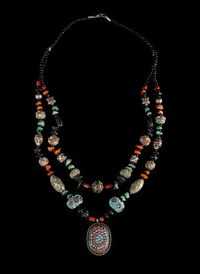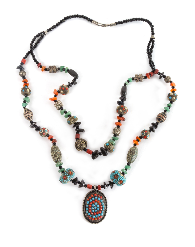 the double strand comprised of naturalistic beads of jade, carnelian, coral, and hardstone, silver beads, and hardstone inset silver beads, the longer strand bisected by a hardstone inset silver pendant.