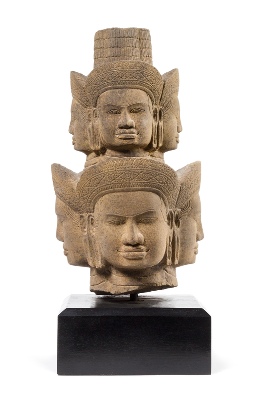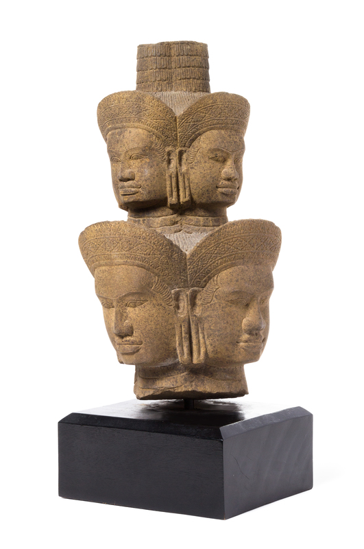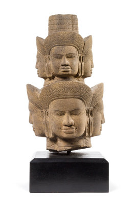 carved to show two tiers of faces, each with a pair of elongated eyes above a straight nose and full lips, flanked by a pair of pendulous earlobes surmounted by a well carved headdress, raised on a later stand.