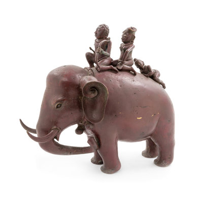 the animal figure cast standing on foursquare, facing forward with a pair of long tusks, one male and two female seated atop the elephant.