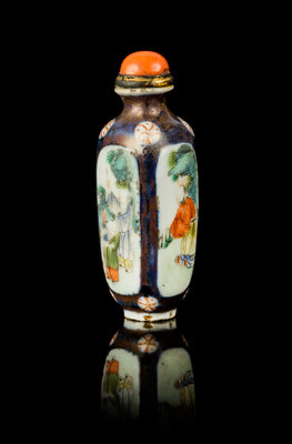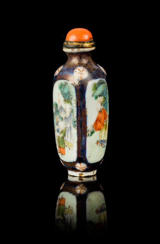 of slightly tapered square section, each side decorated with panels enclosing figures and landscapes, the underside with a symbolic mark.