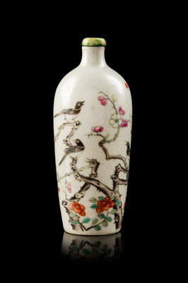 having rounded shoulders, the body painted with magpies perched on prunus branches.