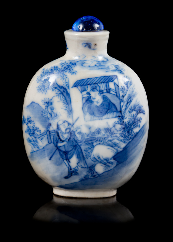 of circular form, painted to the front depicting a scholar standing at the window greeting a bandit in a landscape, the reverse showing two ladies watching a young scholar playing a qin in a garden, the underside bearing an apocryphal Yongzheng four-character underglaze blue mark, having a glass stopper.