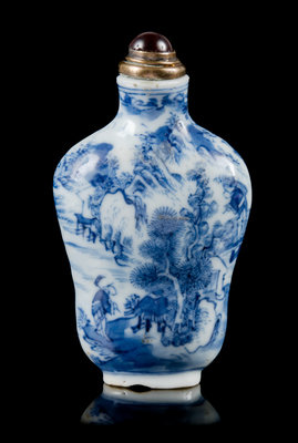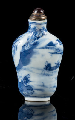 of flattened waisted form, painted with a continous mountainous lanscape scene with a farmer, a woodcutter, a fisherman and two scholars, having a glass stopper.