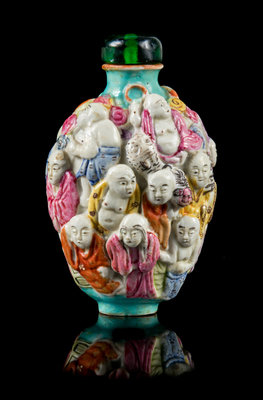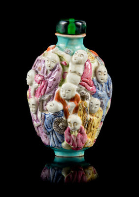 of baluster form raised on a short foot, molded with numerous luohan figures against a turquoise ground, the underside bearing an Qianlong four-character iron red mark.