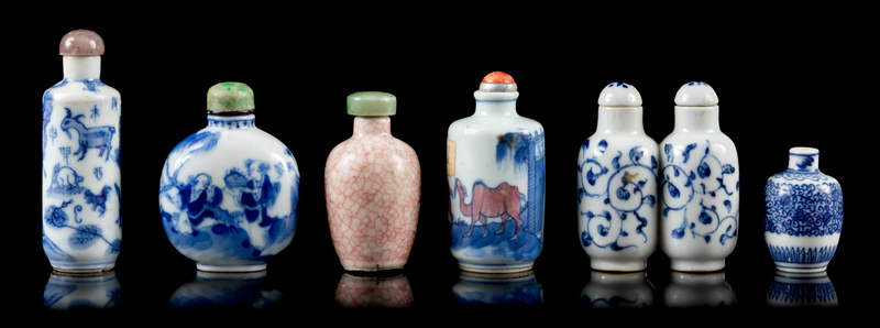 comprising four blue and white examples, the first of circular form, painted to the front with two immortals Hehe Erxian, the underside bearing an apocryphal Yongzheng four-character mark in underglaze blue, the second of cylindrical form, painted overall with twelve zodiac, the underside bearing an apocryphal Yongzheng six-character mark in underglaze blue, the third a double bottle decorated with foliate scrolls, the fourth of small baluster form painted with blooming lotus flowers amongst scrolling vines; a blue and white and underglaze red example of cylindrical form, decorated with three camels outside a gate; a ge- type example of baluster form.