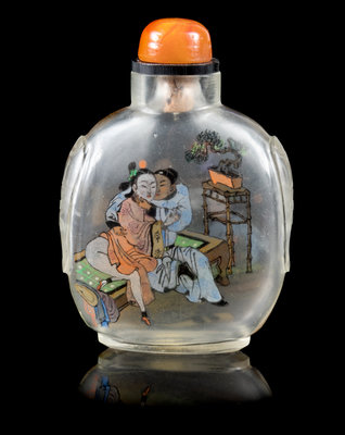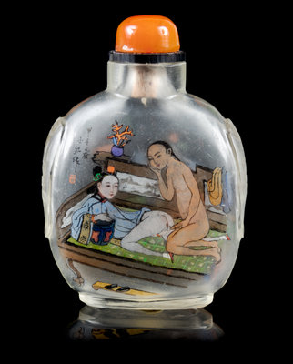 of circular form, painted on both sides showing erotic scenes, signed Xiao Hong zuo.