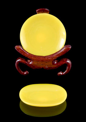 the first of circular form, the second slightly oblong, together with a wooden stand.