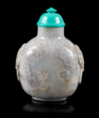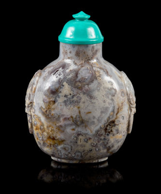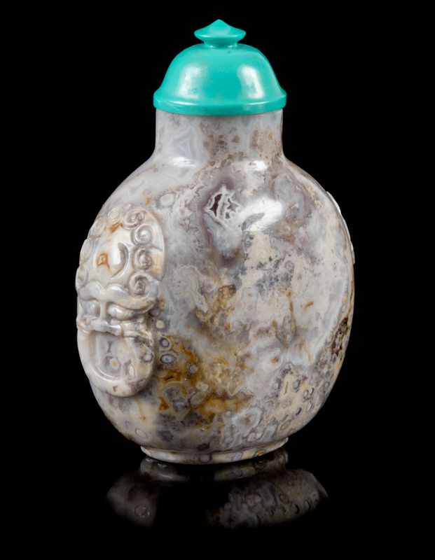 of flattened rounded form, each shoulder carved with a lion mask and mock ring handle.