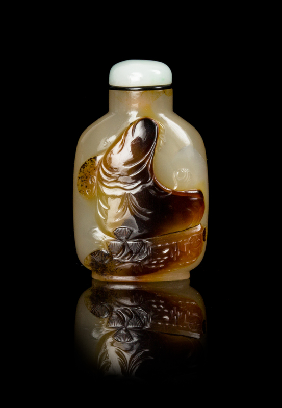 of rounded rectangular form, carved to the dark inclusions showing the monk Damo dressed in draped robes, his one hand holding a crystal ball, a tiger crepping behind his back.