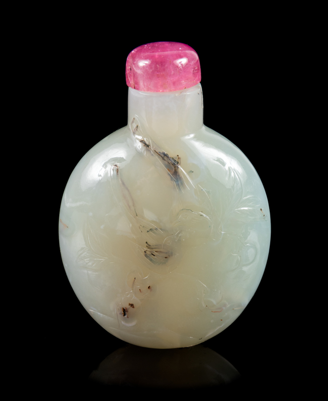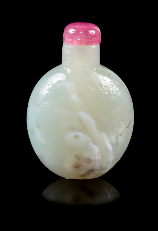 of flattened ovoid form, carved on one side to the white inclusions highlighting a rabbit seated under pine trees, the reverse with two magpies perched on fruiting branches.