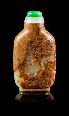 of rounded rectangular form, carved throughout depicting a continuous mountainous landscape showing a scholar seated underneath pine trees, further pine trees extending to the reverse.