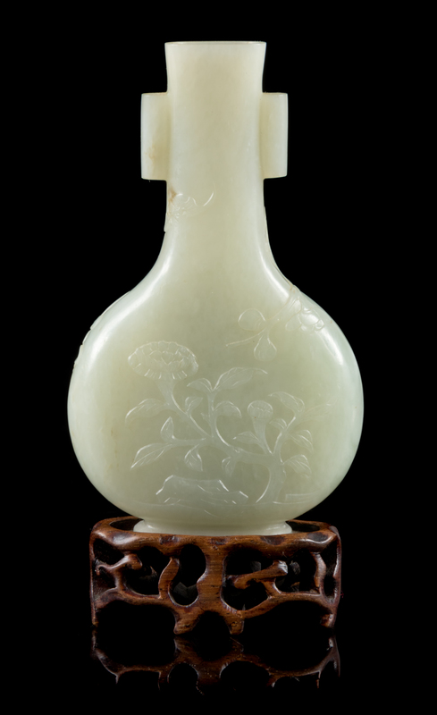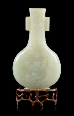 of flattened bottle form, carved on both sides depicting flowering prunus and chrysanthemum, the elongated neck flanked by a pair of lug handles, raised on a fitted hardwood stand.
