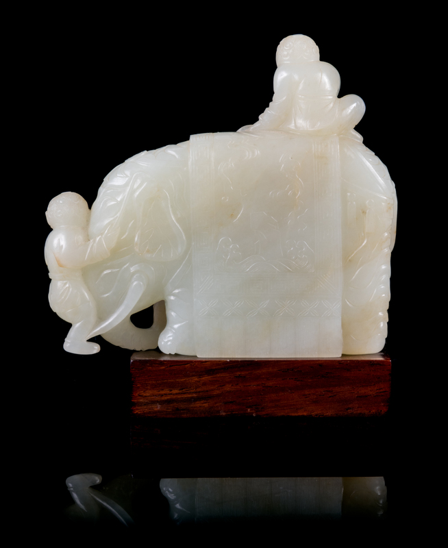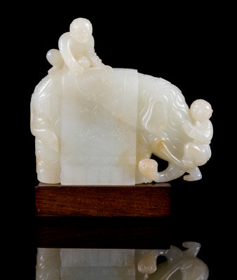 A Pale Celadon Jade Figure of an Elephant and Boys