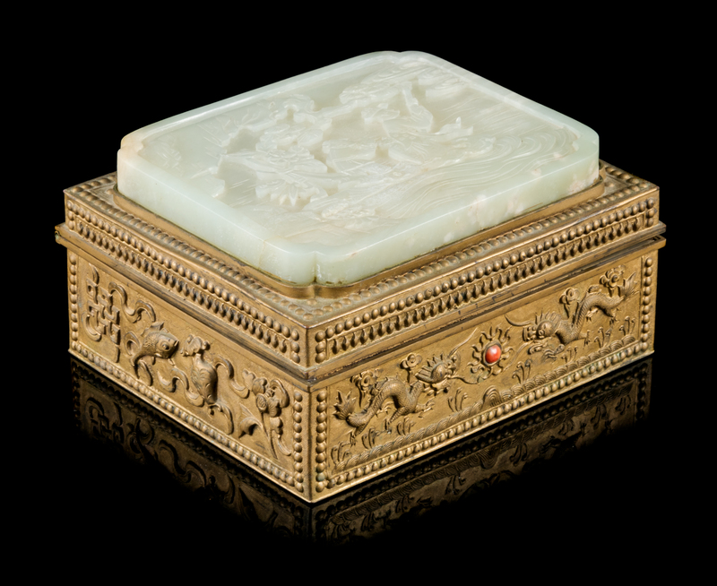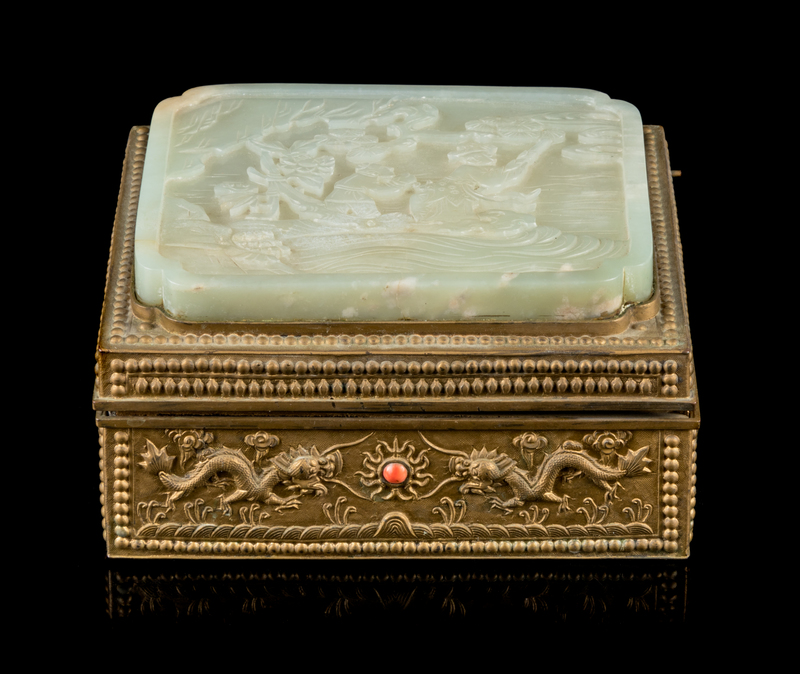 A Celadon Jade Inset Brass Box