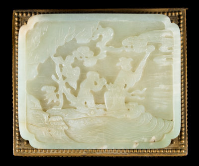 of rectangular form, the cover inset with a large celadon jade plaque carved to depict two immortals underneath pine trees in an outdoor setting, the box cast with dragons and Eight Buddhist emblems.