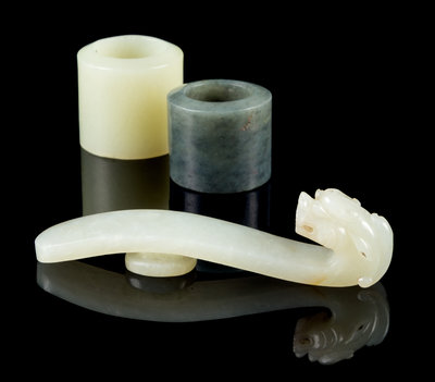 comprising two archer's rings, one of celadon jade, the other black jade; a celadon jade belt hook with a dragon-head terminal.