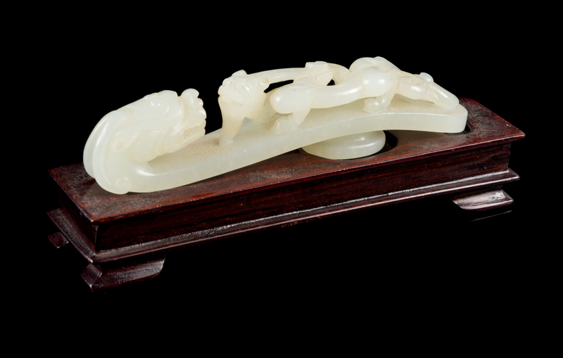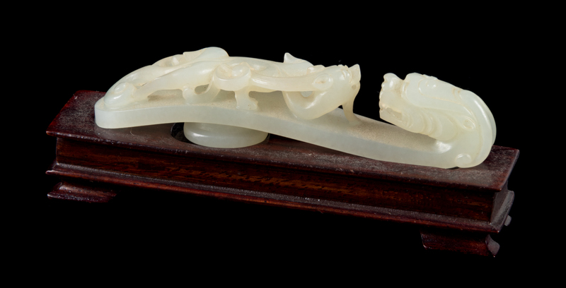 carved with a terminal in the form of a dragon head, the shaft with a sinuous chilong, raised on a fitted hardwood stand.